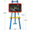 - Bảng 2 mặt gồm: 1 mặt màu đen để bé viết phấn, 1 mặt màu trắng dùng viết bút lông hoặc dán chữ số nam châm, ngoài ra còn có đồ kẹp giấy để bé tập vẽ trên giấy.