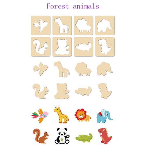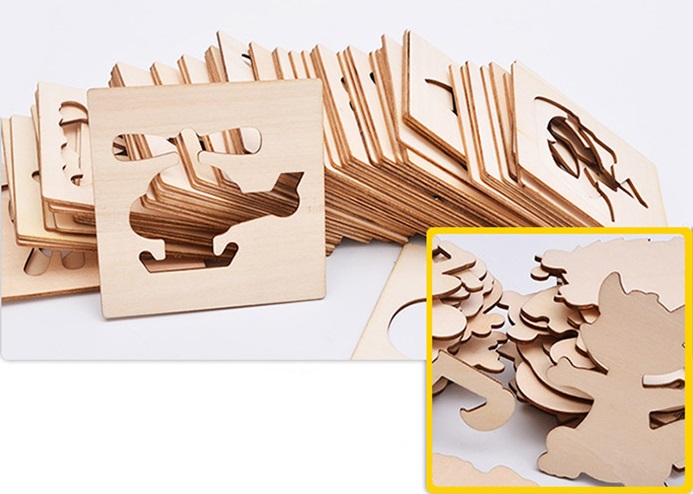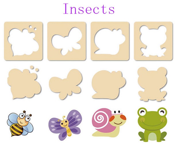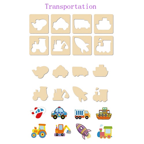 Được chế tạo từ các miếng gỗ, bằng những đường cắt tinh tế để tạo hình các con vật, phương tiện, các loại trái cây, ... bé yêu sẽ có được 2 phần với công dụng khác nhau, phần khung bên ngoài dùng để vẽ lên giấy tạo khuôn để cho bé vẽ; phần hình bên trong bé sẽ tô màu lên theo óc tưởng tượng của mình.