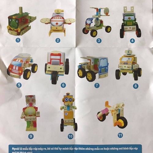 Bộ sản phẩm có nhiều thanh gỗ với khác nhau, bé có thể thỏa thích sáng tạo để lắp ráp thành những mô hình khác nhau: xe hơi, xe mô tô, robot, máy bay,...