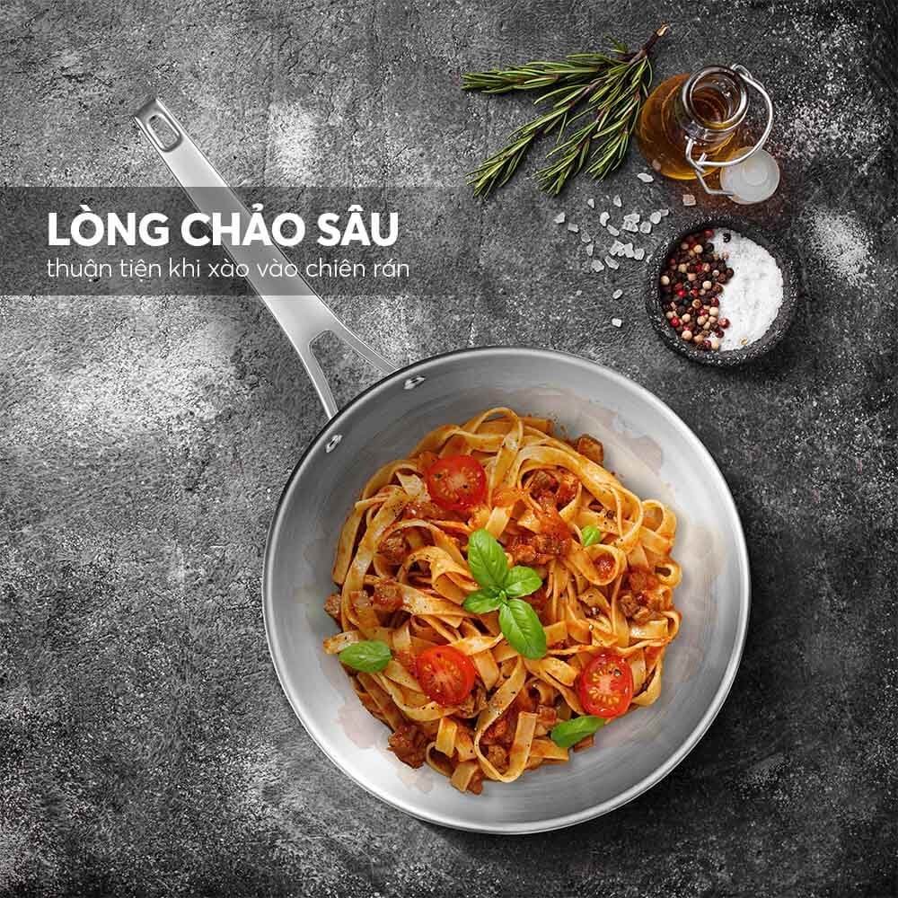 - Chảo có độ sâu lòng cao (chảo 20: cao 5.2cm; chảo 24 - cao 5.8cm; chảo 26 - cao 6.2cm) giúp việc xào nấu dễ dàng, hạn chế rơi vãi đồ ăn ra ngoài.
