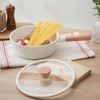 - Tay cầm chắc chắn được làm bằng gỗ tự nhiên chống nóng, vừa thẩm mỹ mà vẫn đảm bảo sự chắc chắn của chảo.