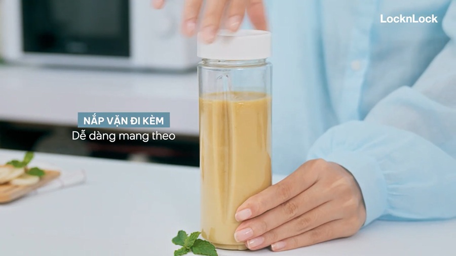 - Máy xay sinh tố mini LocknLock EJM433WHT được thiết kế với cối xay có thể làm bình đựng mang đi với nắp đậy bình đi kèm.