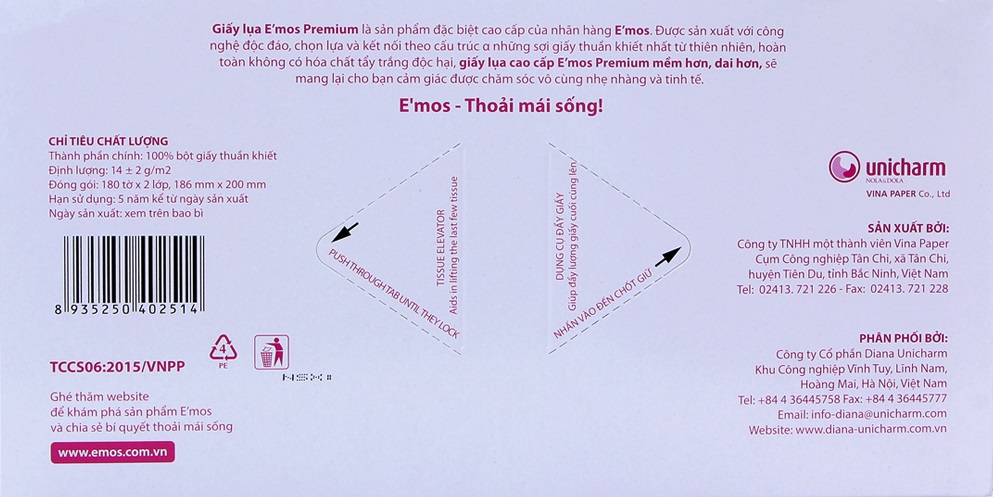 Khăn giấy lụa E'mos Premium được sản xuất với công nghệ độc đáo, dai, mềm mại và đặc biệt có độ thấm hút tốt. Quá trình sản xuất giấy được kiểm soát nghiêm ngặt trong từng giai đoạn, từ khâu tiếp nhận nguyên liệu thô cho đến khi hình thành sản phẩm giấy ăn hoàn chỉnh.