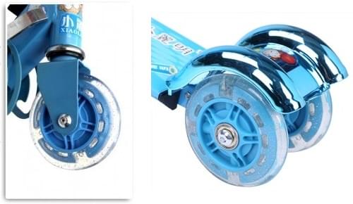 Xe trượt Scooter gồm 3 bánh xe: 2 bánh sau và 1 bánh trước; được làm từ cao su tự nhiên cực kỳ bền và bám dính tốt với mặt đường, giúp xe không bị trơn trượt khi di chuyển. Bánh xe có đèn phát sáng để cảnh báo khi bé sử dụng xe trượt Scooter vào ban đêm. Ở 2 bánh sau có gắn dè làm phanh khi bé muốn giảm tốc độ của xe.